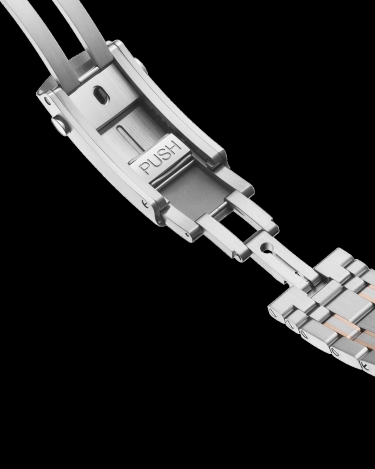 The watch is presented on a stainless steel and 18K Sedna™ gold bracelet and is